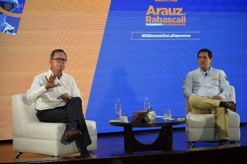 QUITO. El binomio de la Alianza Unión por la Esperanza (UNES) conformado por Andrés Arauz y Carlos Rabascall, en rueda de prensa.